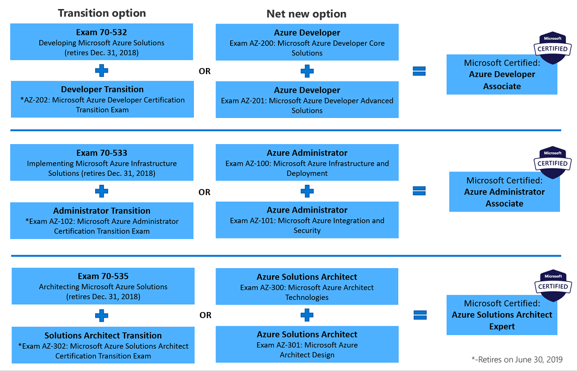 Exams 70-532, 70-533, and 70-535 will retire on December 31, 2018, but will be valid for competencies until December 31, 2019. The new requirements will go into effect on January 1, 2019.